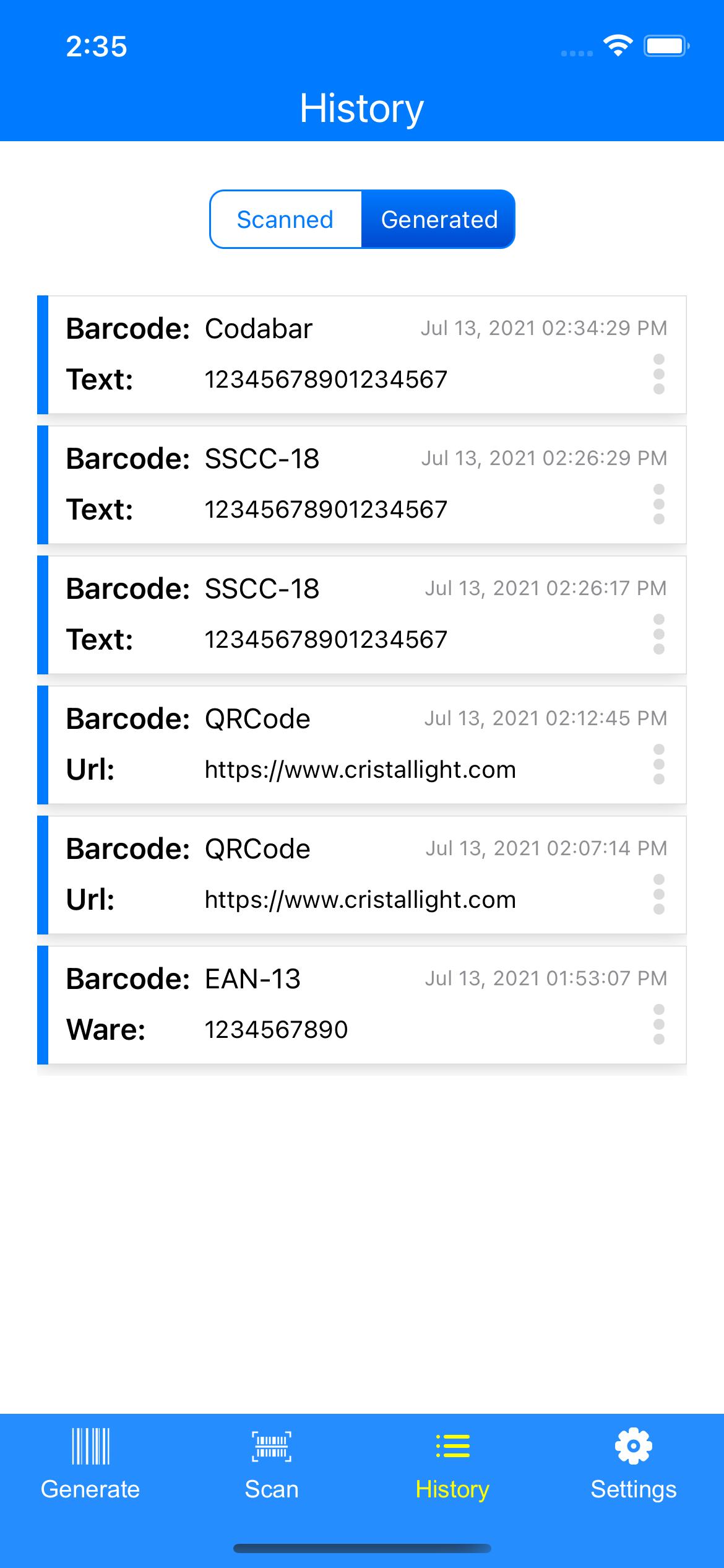 If the appropriate preference settings are made, generated and scanned barcodes data can be saved to history database. You can then Subsequent web search, share, and reproduce barcode with data in history.