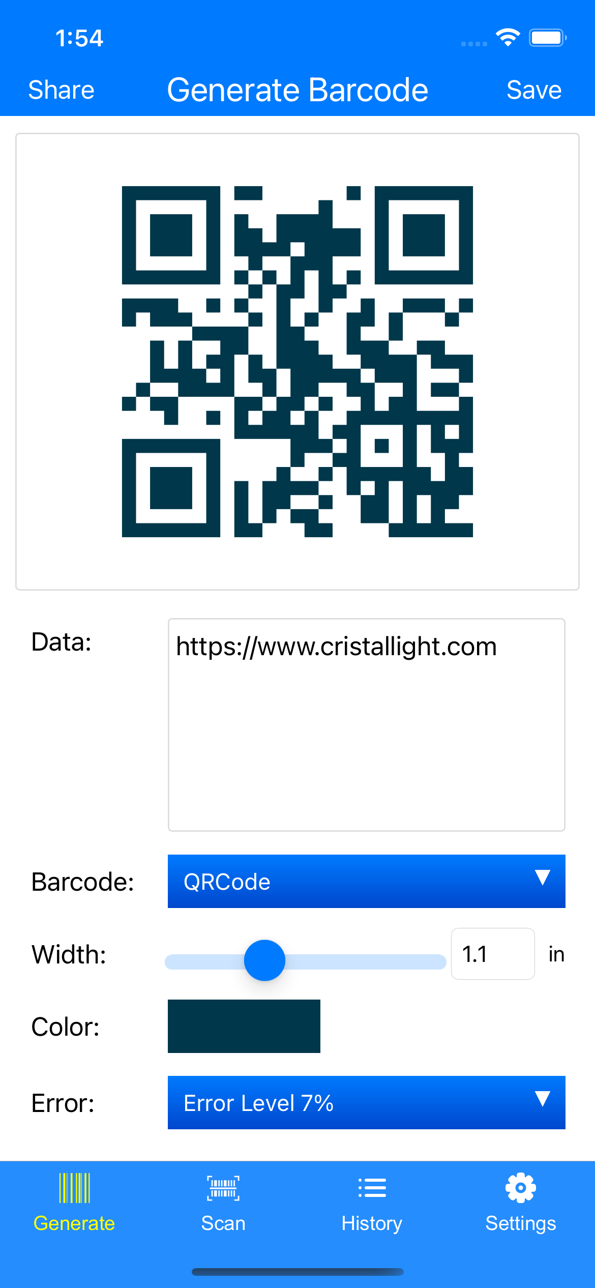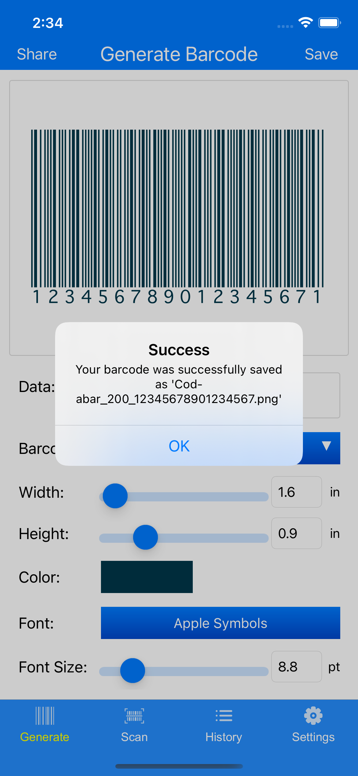 Set the type, size, color, and font of the barcode, save it as image file, or share.