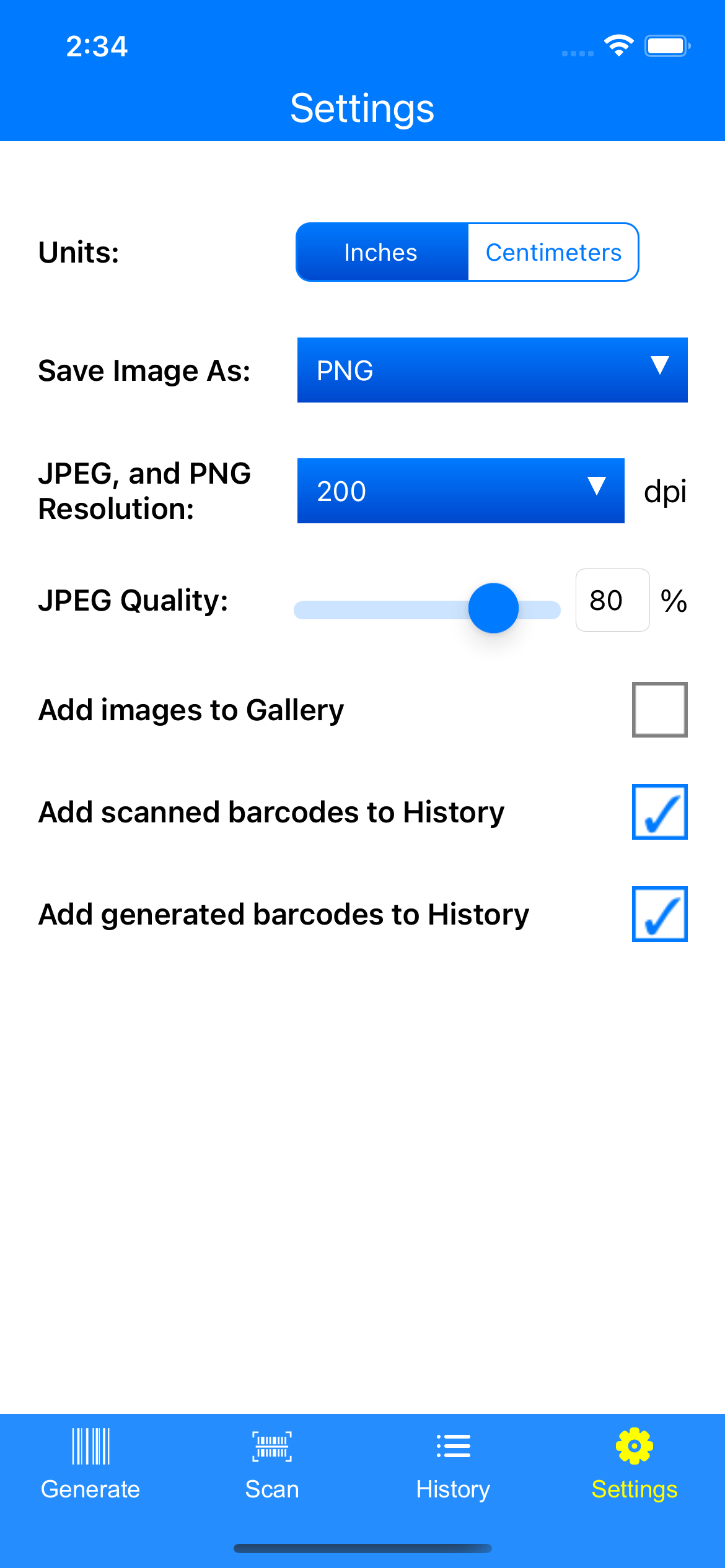 Using iBarcoder preferences you can set the image format for barcode saving, barcode image resolution (for JPEG and PNG). Also there are settings to automatically open scanned urls, or add scanned images to Photos can be made.