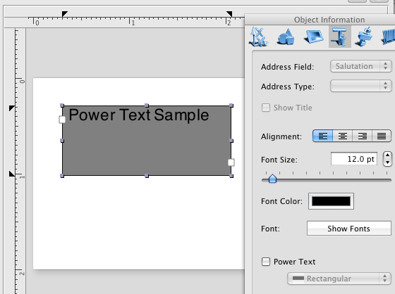 switching to the Graphics tab of the Object Information panel allow you to set the power text all the attributes, usually applied to the object box.