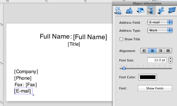 Add Address Book fields, text and graphics to your design. To add an Address Book field, click on the Address Book field tool in the toolbar area, and
