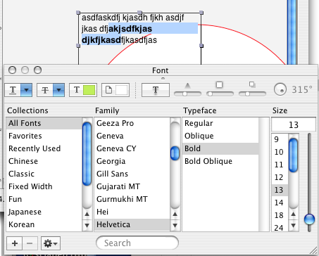 | You can control the appearance of the text added to a rectangular object by assigning the fonts, styles, sizes, and other attributes available in the Fonts palette. To display the palette, activate a rectangular or oval object with the Text tool, or double click on the object, select some text, and use either the Show Fonts option from the Object menu, or click the Font button in the Text properties tab of the Object Properties panel. |