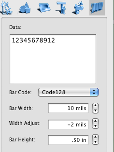The Barcode Properties tab settings can be applied to barcode objects only. Enter the Barcode data string, select the barcode type, adjust bar width and height of your barcode.
