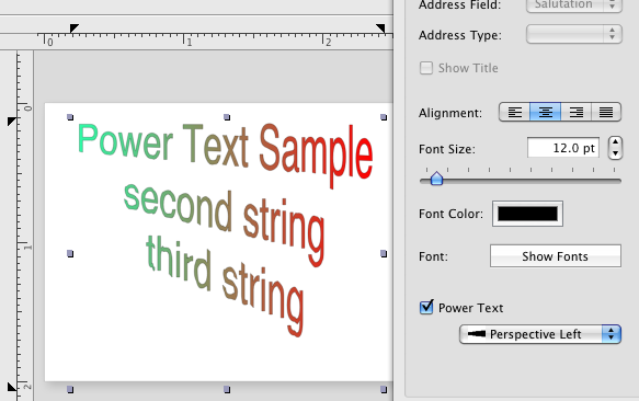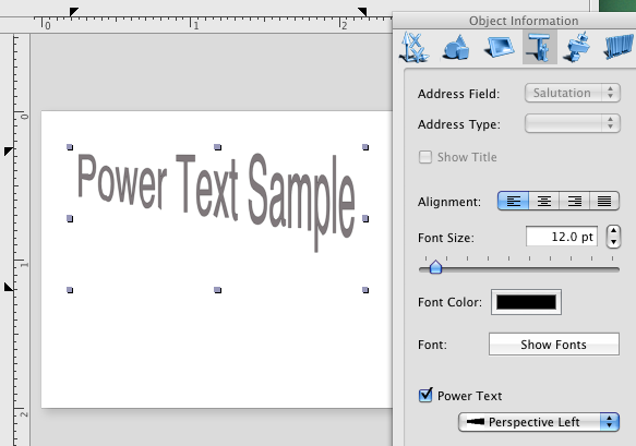 The Home Business Card allows adding 2D effects (set stroke, fill, shadow colors, shadowdistance, blur atc), and also the glyph transformation (geometric deformation of characteds of the text) To start with tis feature you need to add a usual text box to your label, and switch to the Text info panel of the Object Information panel.