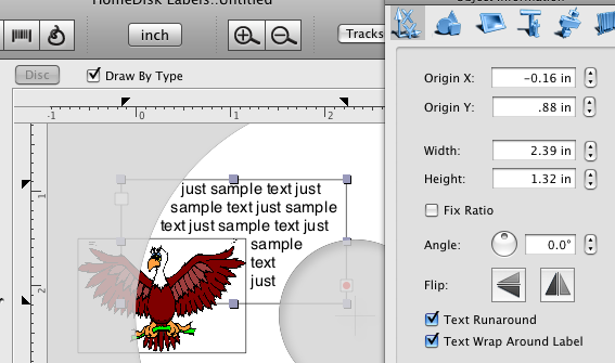 You can control the obejcts order using the Bring to Front/Send to Back menu commands from the Object menu. Also, the text can wrap around the borders of the round labels. Use the Text Wrap around Label check box from the Object Properties tab of the Object Information panel.