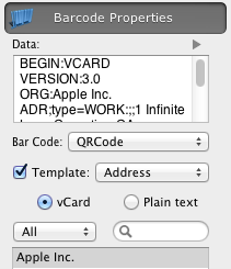 Switching to QR Code or Datamatrix symbologies displays Templates popup, and Address Book controls, that allow to select a person which data to encode as QR code.