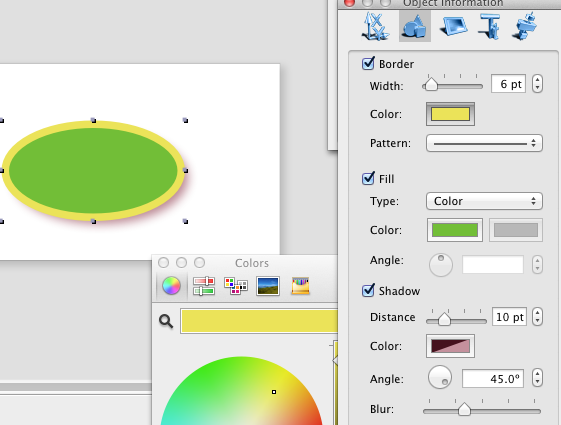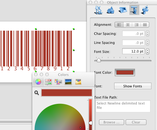 the Object Information panel. You can control the colors of the object border, object fill, gradient, shadow, text, barcode, and image tint color. . To change the color of the text in a rectangular object, or a color of a BARCODE object, switch to the Text Info tab of the Object Information panel, click on the color control to display the Color palette, and, and select the desirable color. .