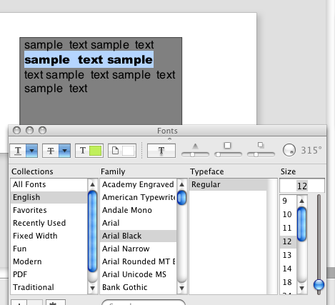 | You can control the appearance of the text added to a rectangular object by assigning the fonts, styles, sizes, and other attributes available in the Fonts palette. To display the palette, activate a rectangular or oval object with the Text tool, or double click on the object, select some text, and use either the Show Fonts option from the Object menu, or click the Font button in the Text properties tab of the Object Information panel. |