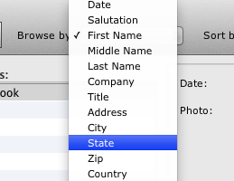At the left bottom of the Database Window, you will see the Database Browser, or, simply, the Browser. Here you should see the list of last names contained in your database. You can select any individual entry by clicking on the person’s last name. Just click on a row to select the record assosiated with that row. You should now see the record in the Database View. The Browser is an easy way to run through your database to find a particular entry. When you begin to make labels from your database, you may occasionally wish to choose a particular database entry to print or preview, you would do this by clicking on the entry in the Browser. How to Change the Browser Field You may sometimes want to view your database by certain database field. Say, you may want the Browser to reflect the Last Name of the database records, or Title, or Address. For example, you need to look for persons by their home state.