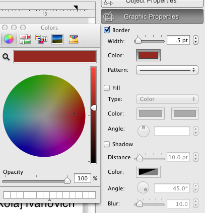 the Graphic, Image, Text and Barcode Properties tabs of the Information Panel panel. You can control the colors of the object border, fill, gradient, shadow, tex, and image tint color. . To change the color of the text in a rectangular or an oval, click the object with the Text tool, or double click on the object, select some text, display the Color palette, and, and select the desirable color.