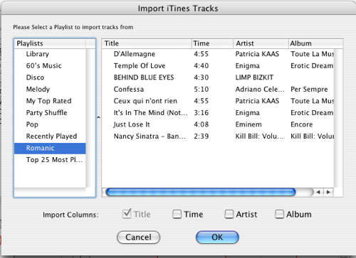 Import Tracks tool appears on the top of the window when an oval or rectangular object is selected. Using it you can import text from an iTunes playlist, folder files list, or from the text file.