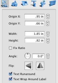 Object properties tab contains the settings that descrive the prosition and dimensions of the object, whether it preserves its ration when resized, controls object angle, filpping. It reflects also if the object is wrapped by the text of the underlying objects (Text Runaround), and whether the text in the object wraps around the label area (for disc labels).
