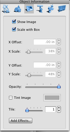 To control the appearance of the image imported to your object use Image Properties To apply color to your image, check the Tint image checkbox. Then click the Color button to choose color. Please note that the original color is transparent. To change transparency of an image use the Opacity slider. The Tile Image tool creates multiple scaled down copies of the image in the original image area.