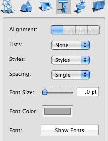 Text properties control the fint, size, color, alignment of the text in the text box. These settings can be applied to the whole text if the the corrent tool if the Object(Arrow) tool, or to the part of the text (Text tool is active). Lists, styles, and spacing attibutes gets enabled when you edit the contens of the text box with the Text tool.