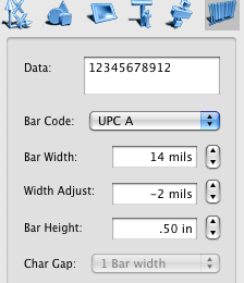 The Barcode Properties tab settings can be applied to barcode objects only. Enter the Barcode data string, select the barcode type, adjust bar width and height of your barcode.